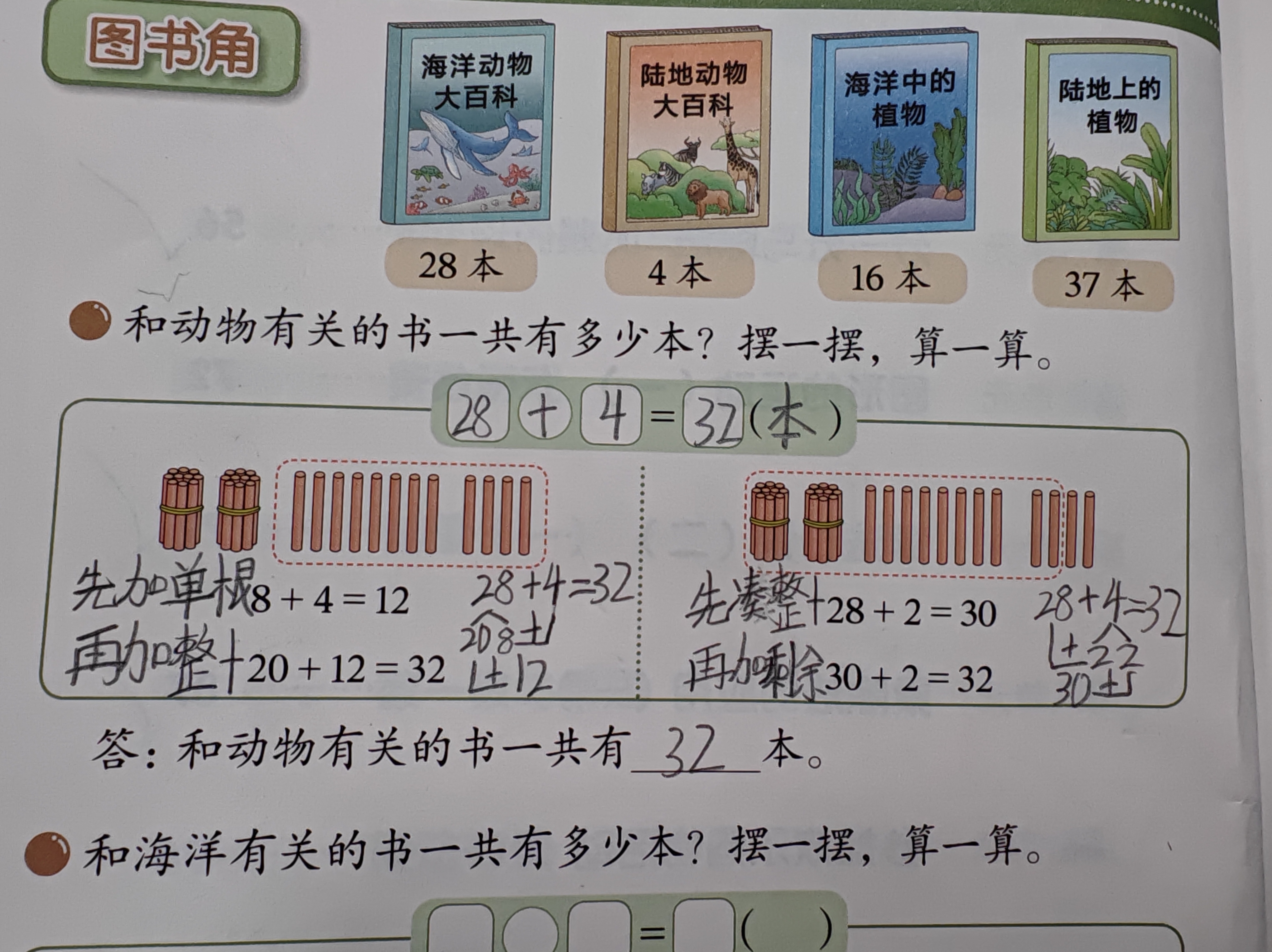 4⃣边摆小棒边说28+4的过程,用书上的两种方法。(参考下方视频)